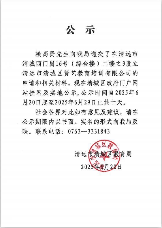 關(guān)于賴高賢先生申請設(shè)立清遠(yuǎn)市清城區(qū)賢藝教育培訓(xùn)有限公司的公示